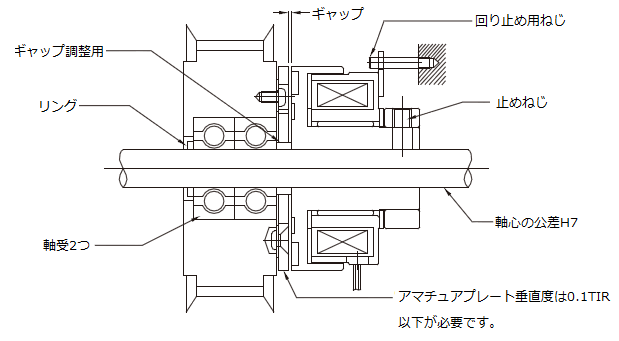 電磁クラッチ・ブレーキ使用初期取り付けによってトルク状態は違います。摩擦面が十分になじんでないため、定格トルクに達しないことがあります。このような場合は初期状態といいます。初期トルクの値は定格トルクの50%~70%になります。軽負荷や低回転速度で慣らし運転をしてから定格トルクに達しします。この場合は、摩擦面の外周温度が80℃以上にならないようにご注意ください。